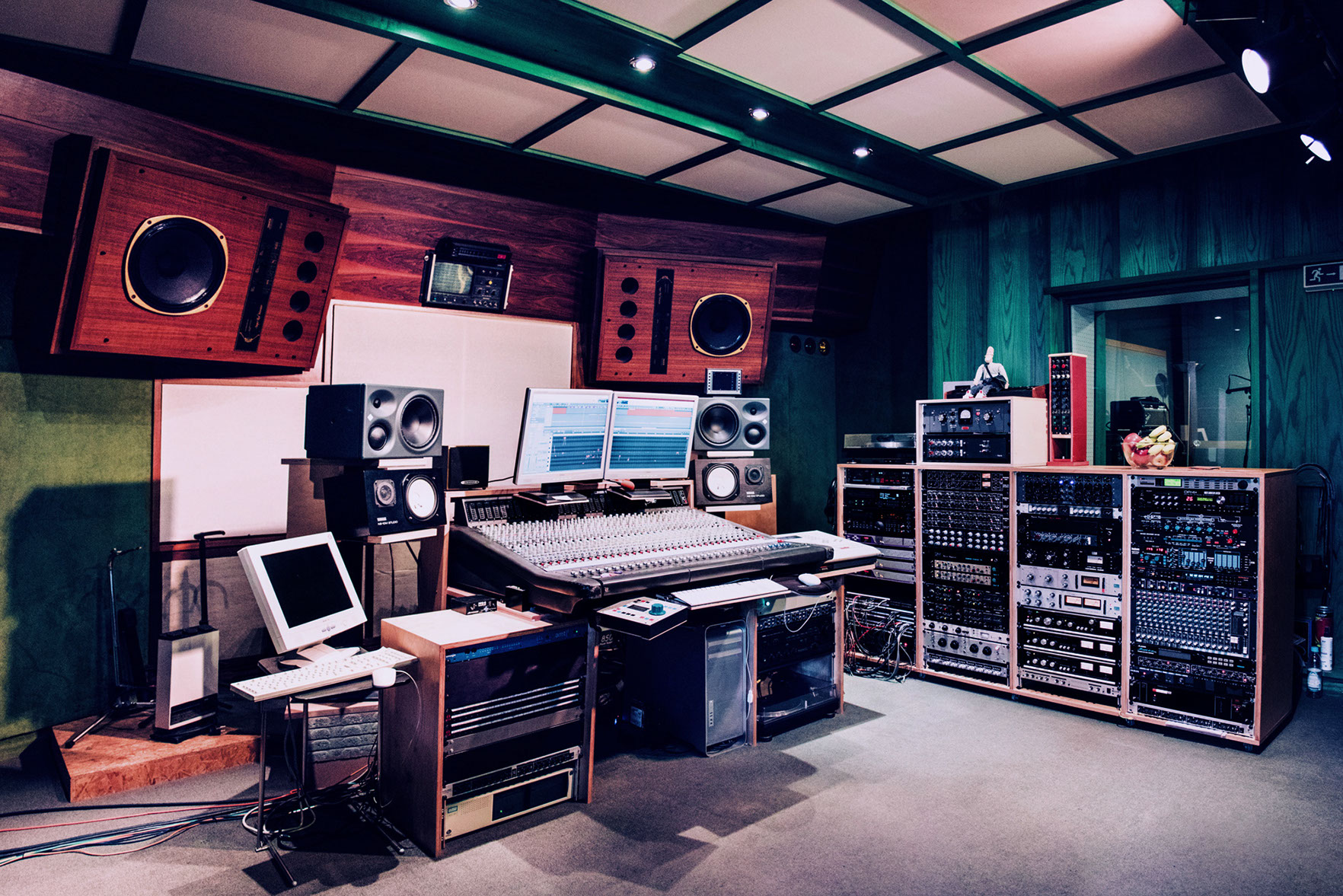 Es gibt im Haus einen ca. 90 qm großen Aufnahmeraum der nach Absprache dazu gemietet werden kann. Der Raum hat zusätzlich zwei separate Kabinen und zeichnet sich durch seine hervorragende Live Akustik aus, dort steht auch unser Bösendorfer Flügel.
